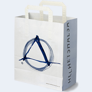 Liten nätt papperskasse, i lagom format för Helhetshälsas produkter. Vit med logotypen i blått på framsidan.