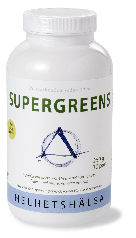 En utvald blandning av alger, groddar, örter med mera. Något som särskiljer SuperGreens från många andra greenspulver är mjölksyrabakterierna. SuperGreens innehåller sex olika stammar, bland annat Lactobacillus Rhamnosus.