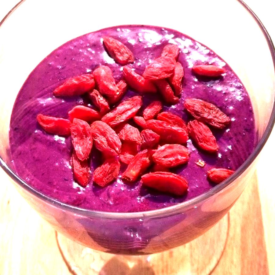 Lägg kokosyoghurten, kokosoljan, bananen, de frusna bären och honung/kokossocker i en mixer och blanda tills du fått en jämn smet.