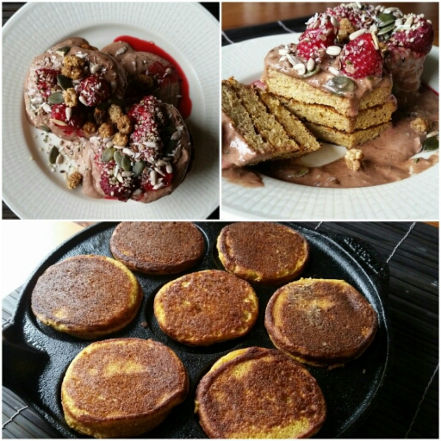 Kör alla ingredienser i en hög bunke med mixerstav. Rör till sist ner bakpulver och låt smeten stå och svälla en stund. Värm upp en plättlagg (om du har) eller stekpanna och klicka i kokosfett. Stek på medelvärme tills det går att vända på dom utan att de faller sönder. Stek någon minut till på andra sidan. Servera med sås på mosad banan, kakao och kokosmjölk plus toppa med ljumna hallon och lite frön.