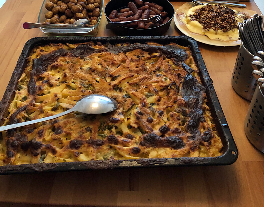 - Blanda allt i en form, strö över ströbröd, vill man ha riktigt smaskigt kan man skiva lite smör över det hela.