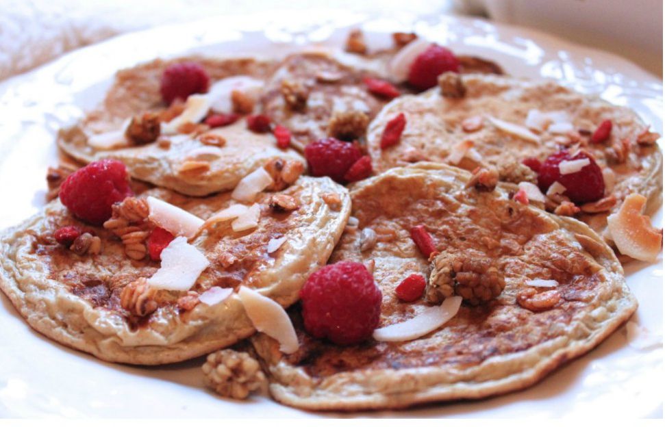 Proteinpannkakor toppade med hallon, mullbär, gojibär, kokosflakes och granola