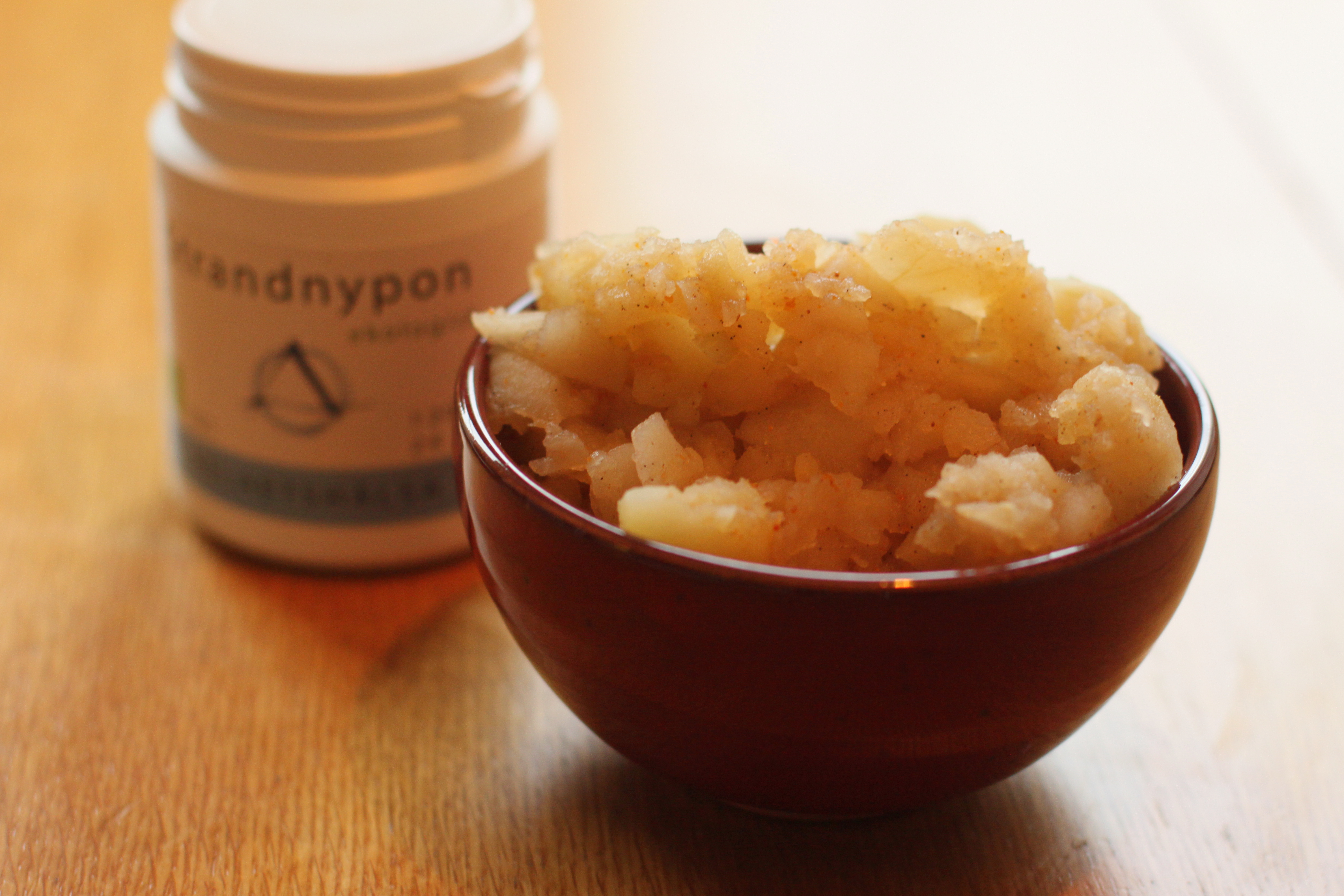 Låt äppelbitarna kokas mjuka, äppelbitarna ska vara såpass mjuka att de lätt faller isär. Häll av kokvattnet och rör ner de övriga ingredienserna.