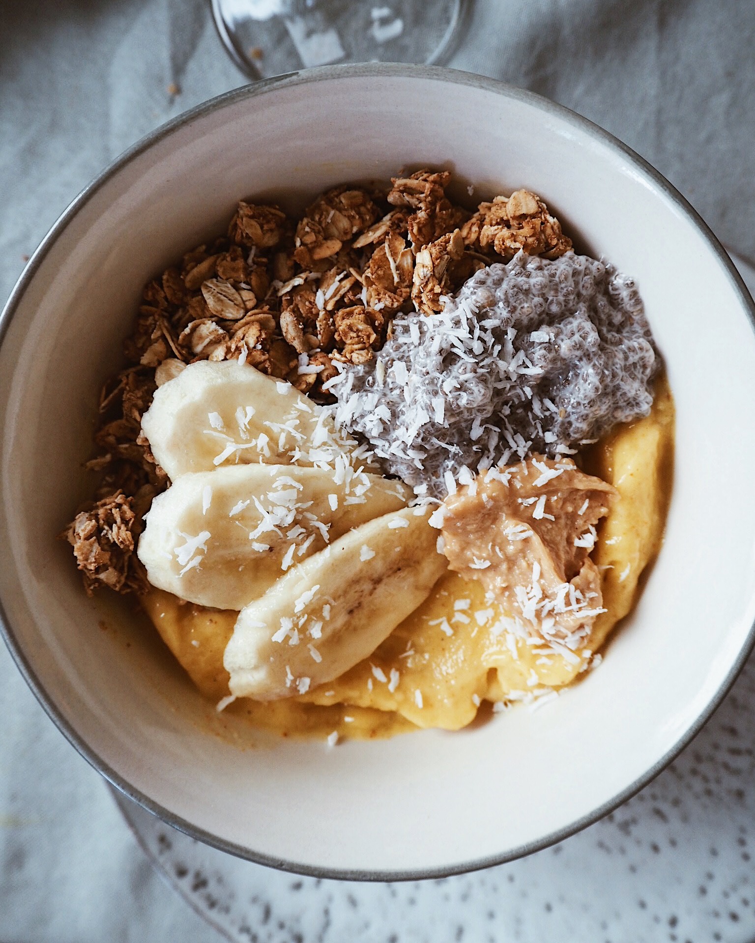 Toppa med granola, chiapudding, jordnötssmör, banan & kokosflingor.