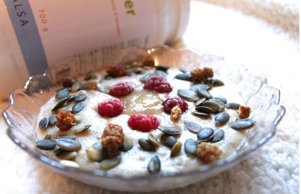Gröten toppades med hallon, mullbär, pumpakärnor eller sockerfritt äppelmos.