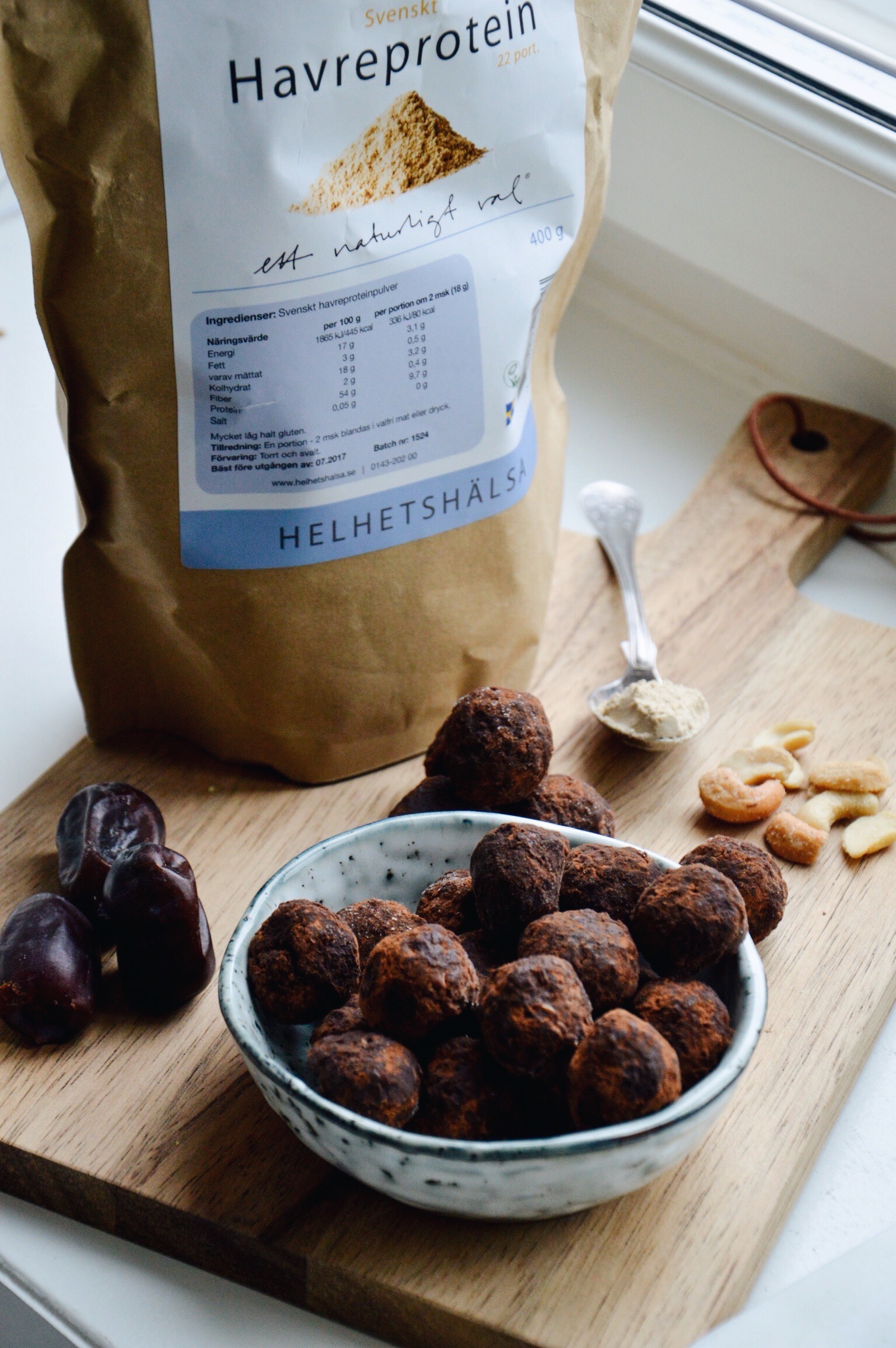 Forma till bollar och rulla sedan i kakao eller kokos.